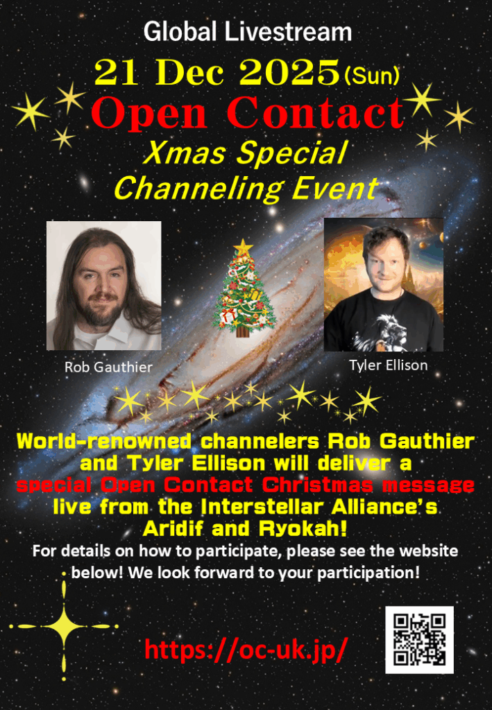 🎄Two world-renowned channelers, Rob Gautier and Tyler Ellison, will deliver a live Christmas Special Message from the Interstellar Alliance beings Aridif and Ryokah, sharing insights on Ascension and Open Contact!